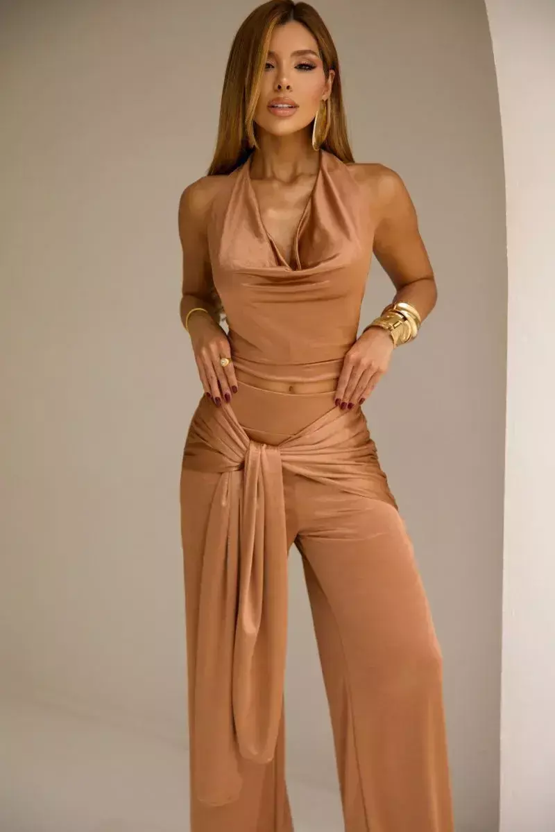 Descubra o encanto do Conjunto Prisma, composto pela blusa frente única degagê e a elegante calça pantalona com amarração. Essa combinação une estilo moderno e conforto, perfeita para quem deseja um visual marcante em festas de fim de ano e ocasiões especiais.